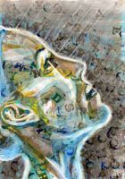 Portret van een vrouw. Dit portret is een schilderij gecombineerd met met stempel letters en inkt. Zijn het woorden van een ander of gedachten in haar hoofd. Misschien heeft ze een brief ontvangen waar ze in haar hoofd nog mee bezig is? Maak je eigen verhaal!