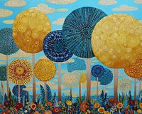Bright Blue and Golden Forest - Dit kleurrijke schilderij toont een speelse verzameling van abstracte bomen met opvallende ronde bladeren in geel en blauw, tegen een heldere achtergrond van een blauwe lucht met luchtige wolken, waardoor het een vrolijke en moderne uitstraling krijgt.