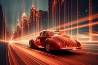 Een antieke auto snelt door een futuristisch stadsbeeld versierd met felle neonlichten. De gloeiende lijnen creëren een gevoel van beweging en combineren klassiek design met een sci-fi-sfeer.