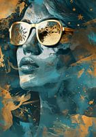 Portret van een vrouw die een zonnige dag tegemoet gaat. Zij kijkt in de zon genietend van het leven. Kleurstelling goud, petrol, blauw, zwart en wit. Pop art. Abstract en verfijnd. Passend bij diverse stijlen en trends. Artist: Bianca ter Riet.