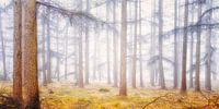 Bright forest. Laatste flarden mist verdwijnen tussen de bomen, de warme kleuren van het bos komen weer tevoorschijn.
