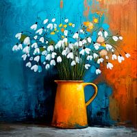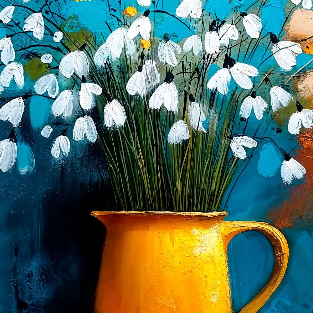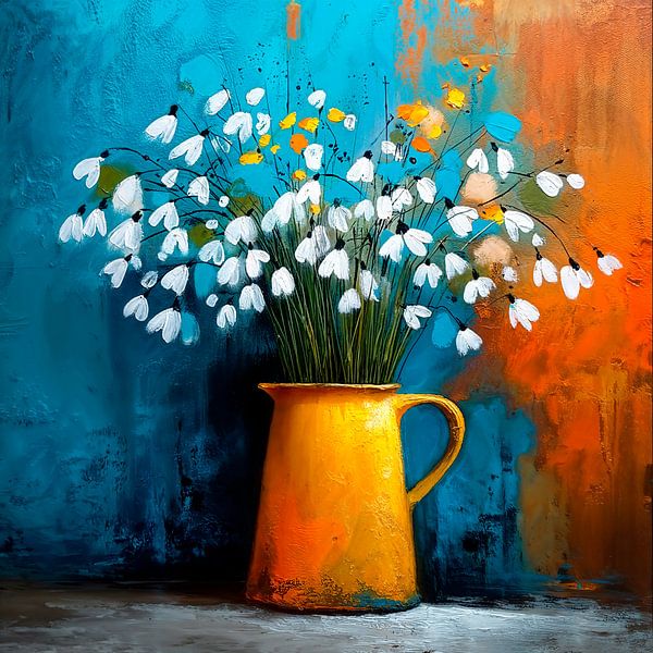 Een levendig, impressionistisch schilderij toont een rustieke gele kan met daarin een boeket sneeuwklokjes. De bloemen hebben kleine, klokvormige bloesem en steken af ​​tegen een dynamische gestructureerde achtergrond. De penseelstreken zijn zichtbaar en energiek, waardoor de scène een gevoel van beweging en leven uitstraalt. De…