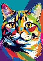 Deze pop-art Britse Korthaar straalt elegantie uit, zijn pluchen, ronde gezicht omlijst door grafische zwarte lijnen, terwijl uitbarstingen van groenblauw, magenta en goudgeel zijn iconische pluchen vacht benadrukken. De kalme, wijze blik van de kat brengt een gevoel van serene luxe, perfect voor interieurs die op zoek zijn naar een mix van klassieke schoonheid met gedurfde, moderne expressie.