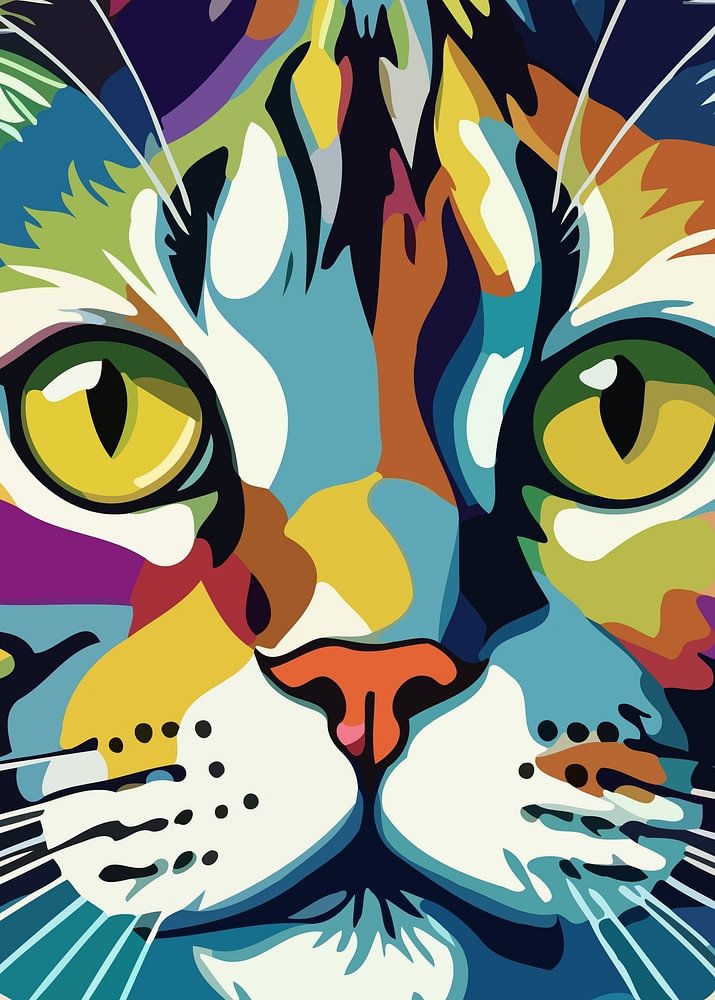 In dit gezellige maar dynamische portret zijn de zachte rondingen van de Britse Korthaar gestileerd met speelse spatten van vurig oranje, levendig blauw en zacht roze. Het kunstwerk combineert de zachtaardige, relaxte persoonlijkheid van het ras met de pittige levendigheid van pop-art, waardoor het een ideaal decoratiestuk is voor kattenliefhebbers die een stijlvol, vrolijk accent in hun huis willen.
