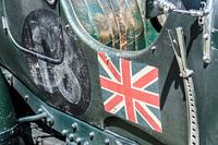 British Union Jack vlag geschilderd op de zijkant van een vintage 1929 Bentley 4 1/2 liter Engelse klassieker in Brits racegroen op een autoshow.