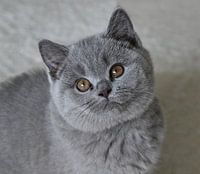 In deze foto ontmoeten we een Britse Korthaar, een ras dat bekendstaat om zijn dichte, fluweelachtige vacht en ronde, expressieve ogen. De kat kijkt recht in de lens met een lichte hoofd kanteling, wat een nieuwsgierige en bijna filosofische uitstraling geeft. De amberkleurige ogen contrasteren prachtig met de koele grijstinten van de vacht en de zachte achtergrond, waardoor het dier het onbetwiste middelpunt van de compositie wordt.