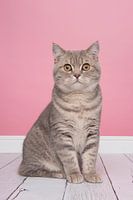 Mooie britse korthaar zittend kijkend in de camera in een roze setting