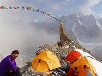 Een alpinist geniet van de rust in kamp 2 van Broad Peak, een berg in het Karakoram gebergte van Pakistan. Het is een van de veertien hoogste bergen op aarde. Klimmers slapen in tenten. Gebedsvlaggetjes wapperen in de wind.