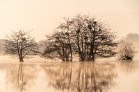 Een groep aalscholvers in een aantal bomen welke bijna onder water staan. Een welkome goedemorgen met mist boven het water en zonsopgang. In de linker boom wordt een jonge aalscholver door een van zijn ouders gevoed.