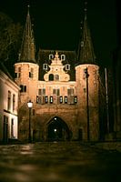 Broederpoort in Kampen in Overijssel, Nederland tijdens een koude winternacht in de oude Hanzestad aan de oever van de IJssel.