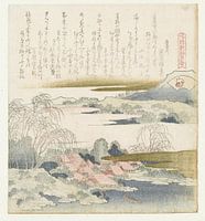 Het dorp Mutsuda, beroemd om zijn treurwilgen, aan de oevers van de Yoshino rivier. Op de voorgrond een veerboot; op de achtergrond een berg tussen mistbanken. Met acht gedichten. De schelp waar de titel naar verwijst is afgebeeld in het waaiervormige cartouche.