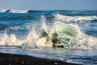 Gletsjerijs in zee bij de lagune van de Jökulsárlón-gletsjer. De golven slaan tegen het ijs en de zon smelt het langzaam.