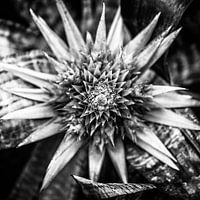 Een Bromelia, een oeroude huiskamerplant in Nederland, gefotografeerd vanuit een verrassend perspectief! Met de top vlijmscherp en een mooi bokeh erom heen. Het zwart wit maakt de opname tijdloos!