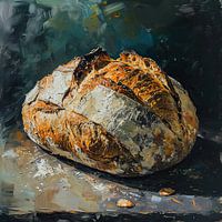 Brood | Gourmet Artisan Bread - Met zijn rijke textuur en gedurfde penseelstreken legt dit schilderij de robuuste schoonheid van een ambachtelijk brood vast, dat bijna tastbaar op de doek rust. De warme goudbruine korst contrasteert prachtig tegen de donkere, gevarieerde achtergrond, waarbij aardetinten en schakeringen van grijs en…