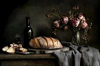 Een rijk en gelaagd stilleven dat warmte, ambacht en vergankelijkheid ademt. Op een verweerde houten tafel rust een robuust, ambachtelijk brood op een snijplank, vergezeld door een glas rode wijn en enkele hapklare stukken brood met kaas en ui. Op de achtergrond een vaas met verwelkte pioenrozen die als zachte, zinnelijke accenten het beeld een romantische melancholie meegeven. De grijze linnen doek en het spel van licht en donker in clair-obscur-stijl geven dit tafereel een tijdloze, bijna schilderachtige kwaliteit. Een ode aan zintuiglijkheid, eenvoud en schoonheid in het alledaagse.
