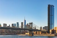 Een foto gemaakt begin november 2022 in de week van de marathon in de namiddag vanaf het water van de skyline van Manhattan met de Brooklyn Bridge op de voorgrond. Op de achtergrond de Freedom Tower en de wolkenkrabber.