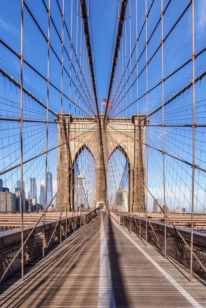 Na zonsopgang op de beroemde en zelden verlaten Brooklyn Bridge, die Brooklyn en Manhattan met elkaar verbindt.