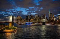 De fonkelende lichten van de stad worden weerspiegeld in de East River en creëren een betoverend samenspel van licht en schaduw dat de dynamiek en elegantie van New York 's nachts perfect weergeeft. De iconische Brooklyn Bridge strekt zich majestueus uit over het water en symboliseert de verbinding tussen verleden en toekomst, tussen traditie en innovatie.