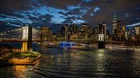 De fonkelende lichten van de stad worden weerspiegeld in de East River en creëren een betoverend samenspel van licht en schaduw dat de dynamiek en elegantie van New York 's nachts perfect weergeeft. De iconische Brooklyn Bridge strekt zich majestueus uit over het water en symboliseert de verbinding tussen verleden en toekomst, tussen traditie en innovatie.