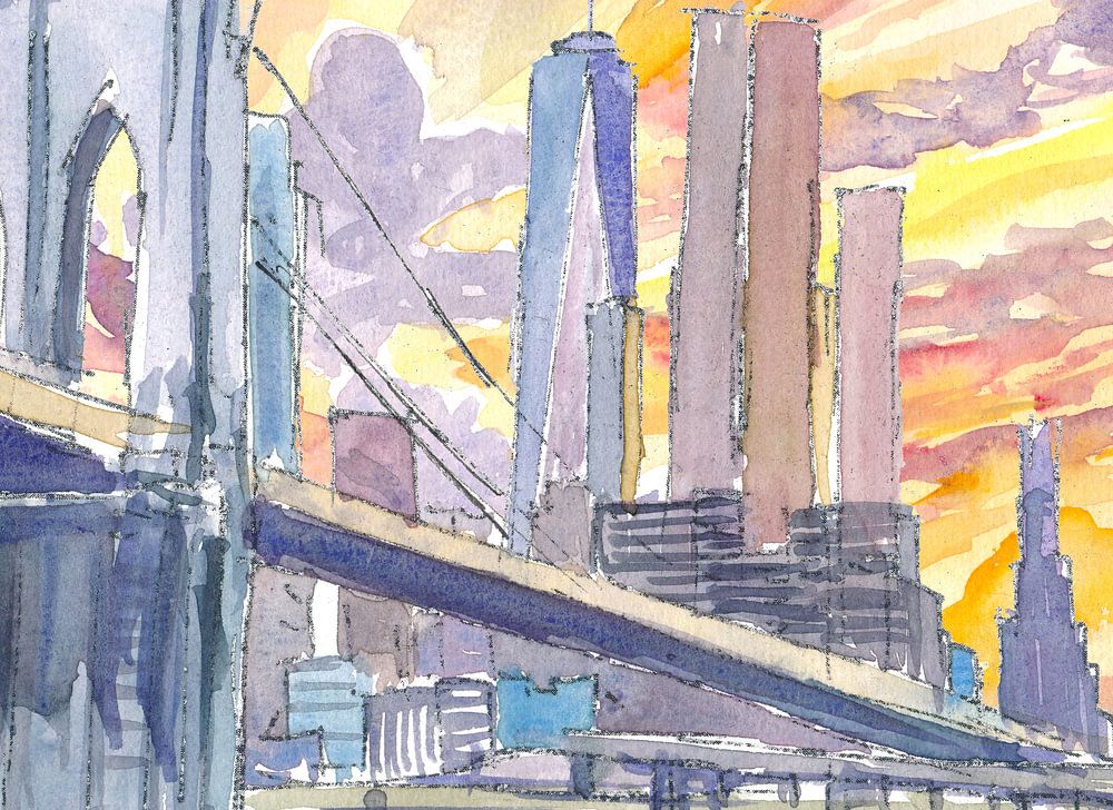 Brooklyn Bridge bij zonsondergang met de skyline van Manhattan