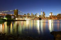 Brooklyn Bridge en Manhattan New York skyline in de avond. Het hoogste gebouw is One World Trade Center.