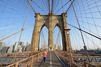 Brooklyn Bridge in New York in de ochtend met een hardloper.