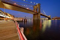 De in 1883 gebouwde Brooklyn Bridge is een hangbrug in New York over de East River. Hij verbindt Brooklyn met Lower Manhattan, net als de Manhattan Bridge (deze zie je daarachter).