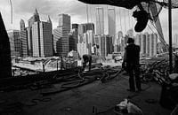 Onderhoudswerkzaamheden aan Brooklyn Bridge met op de achtergrond een mooi uitzicht op Manhattan. Gefotografeerd in 1989 op Kodak zwart-wit film gedurende een rondreis door de Verenigde Staten van Amerika. Filmkorrel is zichtbaar in de afdruk.