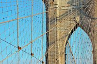 Een closere opname van het kabelvlechtwerk, genomen op de Brooklyn Bridge, New York City. De in 1883 gebouwde Brooklyn Bridge is een hangbrug in New York in de Verenigde Staten. Ze gaat over de East River en verbindt Brooklyn met Lower Manhattan.