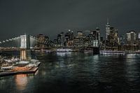 De Brooklyn Bridge bij nacht - gezien vanuit Brooklyn, met de glinsterende skyline van downtown Manhattan op de achtergrond. De lichtjes van de stad worden weerspiegeld in het water, terwijl de iconische staalkabels van de brug 's nachts de hemel van de stad doorkruisen. Een tijdloos beeld van de magie van New York bij zonsondergang.