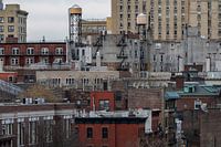Kleurenfoto van Brooklyn gezien vanaf de Brooklyn Bridge in New York City. Altijd weer een mooi gezicht met die rode bakstenen gebouwen met die waterreservoirs op de daken om de onderliggende gebouwen van voldoende waterdruk te voorzien.