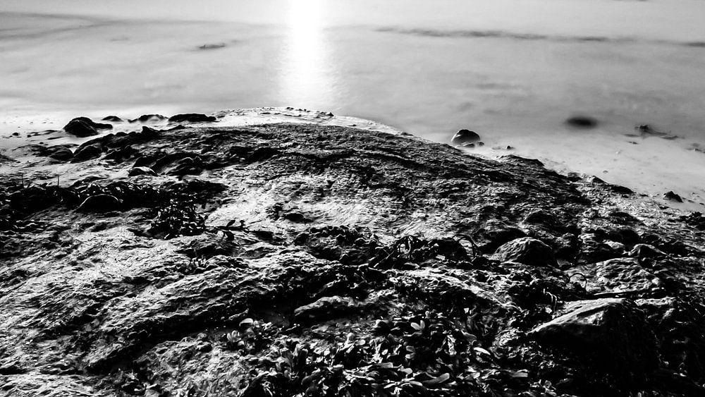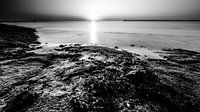 Brouwersdam bij zonsondergang. Omgezet naar zwart-wit. Opname gemaakt aan de zeezijde bij de haven en de trailerhelling.