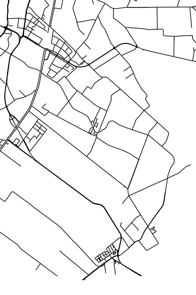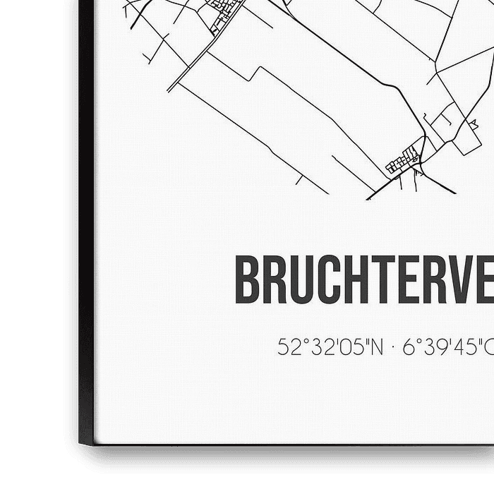 Zwart-witte landkaart, stratenplan of plattegrond van Bruchterveld. Bruchterveld is gelegen in de gemeente Hardenberg, provincie Overijssel. Op de stadskaart zijn alle openbare wegen in Bruchterveld opgenomen. Verder is de kaart voorzien van de coördinaten van het centrum van Bruchterveld.