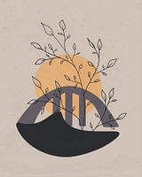 Minimalistisch landschap met een donkergrijze inkt lijntekening van een plant met kleine bladeren, die bij een meertje groeit. Achter het meertje is een grijze brug te tien met een donkergele avondzon. De achtergrond is lichtgrijs. De illustratie is met aquarelverf geschilderd met een zichtbare textuur.