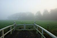 Afbeelding van een witte brug, een mooi oud hek en een weiland in Overveen, Noord-Holland. Foto is gemaakt op een ochtend met lichte mist die het landschap een beetje mysterieus maakt. Op het gras zit een zwaan.