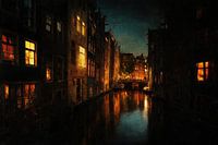 Een brug ligt in de verte, zacht verlicht, bijna als een ankerpunt in een donker stadslichaam. Het licht lijkt zich te verzamelen rond de brug en verspreidt zich vervolgens over het water in trillende strepen. De omringende gevels blijven grotendeels in schaduw, waardoor het beeld een sterke diepte krijgt. Je kijkt niet alleen naar een…