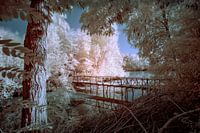 Een brug over een vijver in Eerde vlak bij de Vlagheide in Noord-Brabant, Nederland. Gefotografeerd in infrarood.