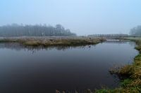In de mist strekt het bruggetje zich over de koude winterse Drentsche Aa.