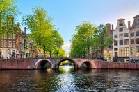 Prachtige opname van de Herengracht kijkend op de brug over de Leidsegracht in Amsterdam met een blauwe lucht boven de grachtenpanden in de lente