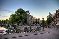 Prachtige opname van de bruggen over de Looiersgracht en de Prinsengracht vroeg in de ochtend in Amsterdam met fietsen op de brug aan de gracht
