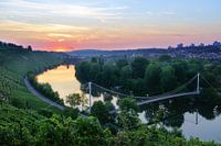 Brug over de Necker in Stuttgart aan de Max-Eyth-See met wijngaarden bij zonsopgang. Max Eyth Brug