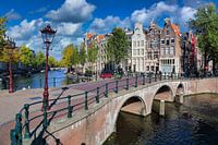 Brug en lantaarnpaal, gracht en herenhuizen in de herfst in Amsterdam