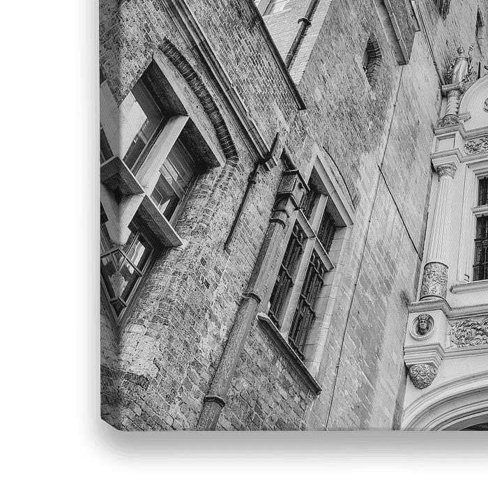 Koop de foto Brugge België poort en gebouw van de Blinde Ezelstraat in zwart wit van Marianne van der Zee op canvas, aluminium dibond, (ingelijste) fotoprint, behang en ArtFrame, op maat geprint in Fine-Art kwaliteit.
