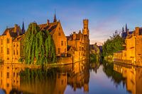 Deze foto van het sfeervolle Brugge (België) is gemaakt tijdens een intens blauw uurtje op een avond in augustus 2016. De foto is gemaakt bij de Rozenhoedkaai en de toren op de achtergrond heet de Belfort van Brugge.
