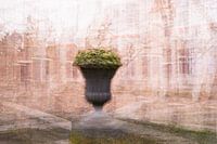 Close up van een vaas met mos die op een muurtje staat. Hier is gebruik gemaakt van meervoudige belichting in 'Pep Ventosa stijl', waar 10 foto's in de camera samengevoegd zijn, wat voor een schilderachtig en abstract effect zorgt.