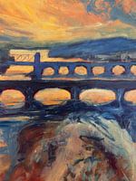 Bruggen verbinden. Wegen van A naar B, passages over rivieren, dalen en bebouwing. Het getoonde werk is een detail uit een groter werk dat ik maakte van de bruggen van Maastricht zoals zij de Noord Zuid skyline van Maastricht bepaalden. De Sint Servaasbrug (Aw Brögk) naar Romeins ontwerp ligt nog fier over de rivier. De stenen Wilhelminabrug (Nuij Brögk) vooraan met haar klassieke bogen heeft na de verwoesting tijdens de Tweede Wereld Oorlog plaats moeten maken voor nieuwe stalen brug. Jammer, het Parijs-achtige karakter van de stad was daarmee een beetje verloren gegaan. Inmiddels zijn er drie bruggen bijgekomen: de Noorderbrug, De Hoog (voetgangers en fietsbrug) en de President Kennedybrug. Namiddagsferen met de blik naar het Zuiden, tegenlicht en met de Sint Pietersberg in de verte. Een prachtig werk voor aan de muur hier te bestellen als premium re-productieprint.