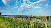 Noord-Holland is een mooie vlakke groene en waterrijke provincie. En dus veel water wat soms in de weg zit om je weg te vervolgen. Maar het mooie is dat daar natuurlijk de diverse bruggen en bruggetjes voor zijn uitgevonden zoals deze mooie en karakteristieke brug die je ogenschijnlijk van het ene weiland naar het andere weiland brengt. Dus met name voor de boer zelf of de doorgewinterde wandelaar. En met een beetje mazzel is er ook nog een smal schelpen fietspaadje aangelegd. Deze brug staat in gemeente Koggenland.