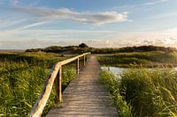 Dit bruggetje is gelegen in het prachtige natuurgebied nabij Terschelling-West. Het leidt je over water, waarin keien liggen. Aan de kant staat riet. Je kijkt uit over de duinen en over het Groene strand richting de Noordkaap. De foto is gemaakt in de zomer, augustus 2023