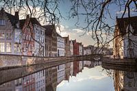 Brugge kent een paar heel fotogenieke plekjes waaronder deze aan de Spiegelrei/Spinolarei. De foto werd genomen vanaf de Sint-Annarei. Het gladde wateroppervlak maakt een perfecte weerspiegeling van de historische huisjes en de wolken en de takken van de boom geven de foto wat diepte.