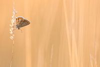 Tijdens zonsopgang in het Limburgse landschap heb ik deze vlinder gefotografeerd. Het is het prachtige Bruine Blauwtje, een kleine vlinder die s'ochtends te vinden zijn op hun slaapplaatsen. Ze rusten op de stengels van onder andere grassen.